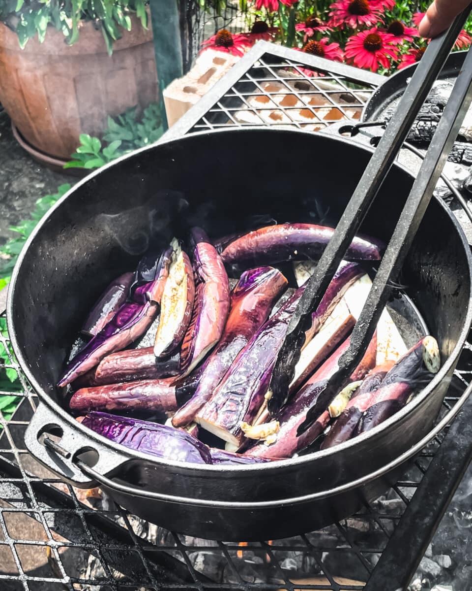 Des aubergines asiatiques, cueillies directement au jardin et cuites au feu de bois