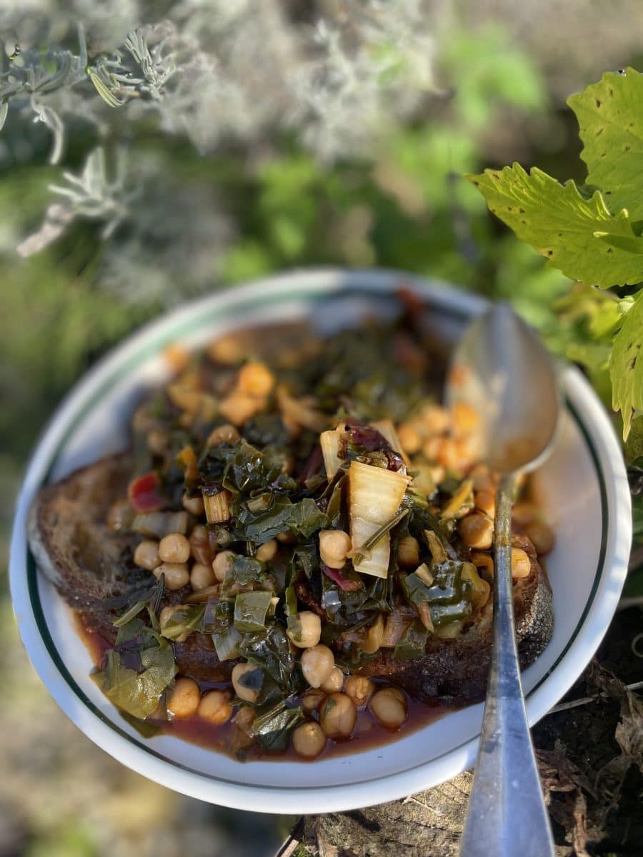 Depuis plusieurs semaines, j’attendais le moment d’allumer mon feu, poser ma casserole et me mettre au travail… Mais la météo n’était jamais de mon côté. Finalement, j’ai trouvé une petite fenêtre de beau temps et j’ai foncé. Voici donc une soupe dans la plus pure tradition des soupes paysannes, servie sur une belle tranche de pain. Cela la rend particulièrement réconfortante et nourrissante en cette fin d’automne, éblouissante de simplicité, parfumée et parfaitement équilibrée.